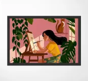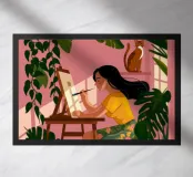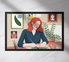 A person is sitting at a desk, drawing or writing, surrounded by lush plants. The setting is artistic and filled with greenery.