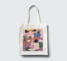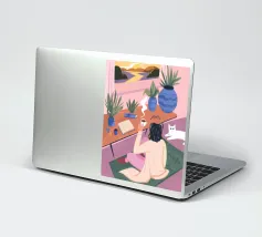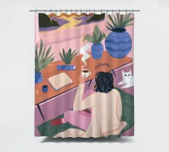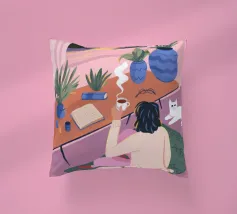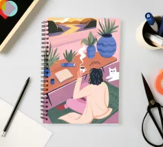 A person is sitting on the floor in a room filled with plants, books, and a cat, engaged in a moment of creative solitude and contemplation.