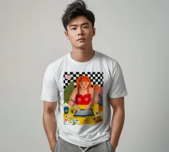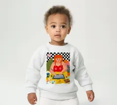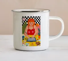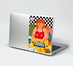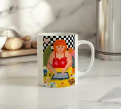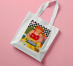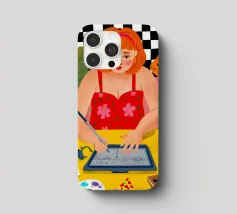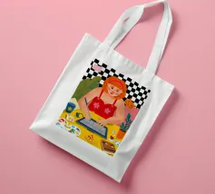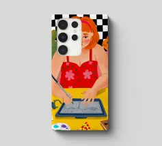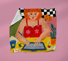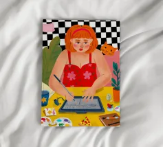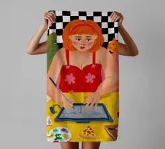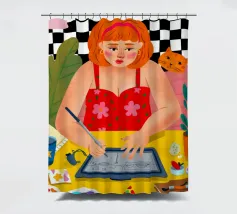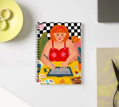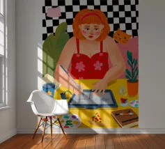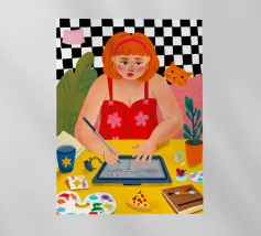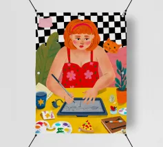 A red haired girl draws amid colorful supplies, blooming with imagination and creativity.