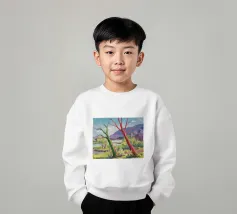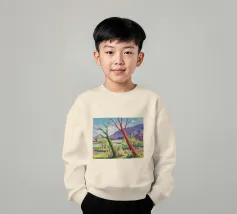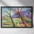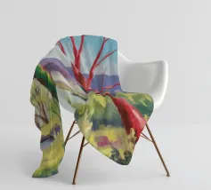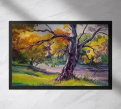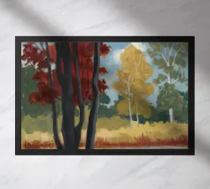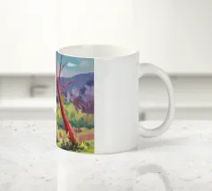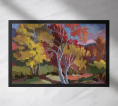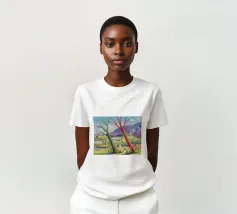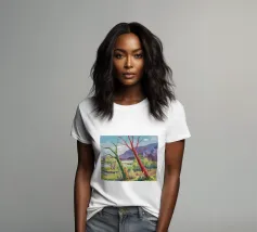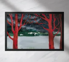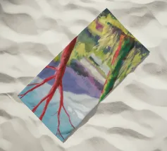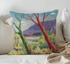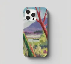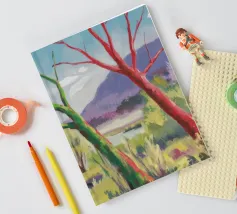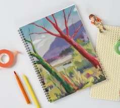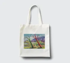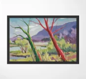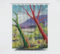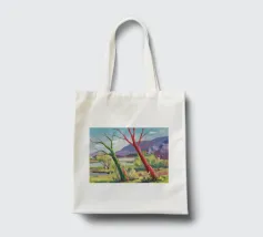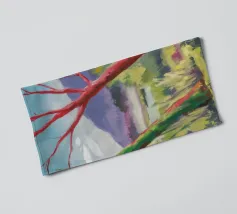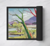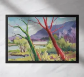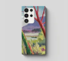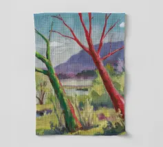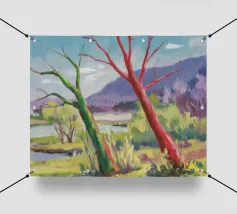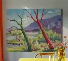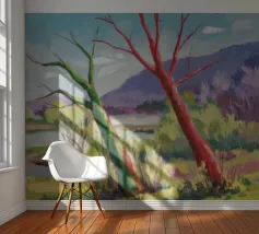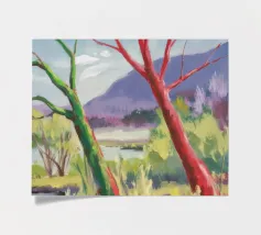 A stylized landscape painting featuring a striking tree with a vivid red trunk as a focal point, with a winding green path or river leading through the scene towards distant, soft blue hills under a bright, clear sky.