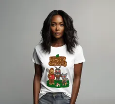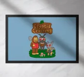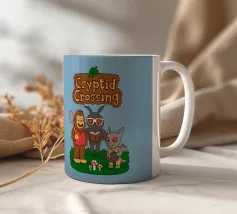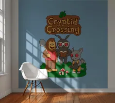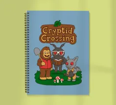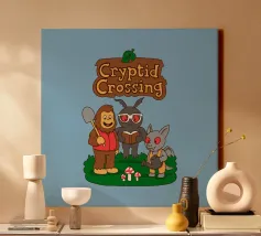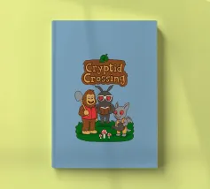 This illustration shows Bigfoot, Mothman, and an Ahool standing together on a grassy patch with mushrooms, all drawn in a soft and playful style. The artwork is a humorous parody that blends famous cryptids with the cozy, charming atmosphere of Animal Crossing, highlighted by the pun “Cryptid Crossing.” Perfect for fans of folklore, cute gaming aesthetics, and anyone who loves clever twists on iconic video game vibes.