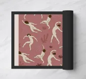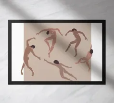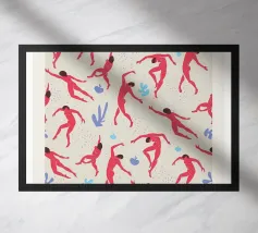 dancing figures pink leaves acrobats movement nakedness human forms nature elements pattern vintage poster abstract shapes trees twisting poses spring theme playfulness bodies fluidity