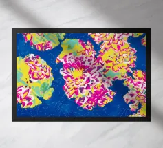 In this print titled "Orbs Dance" artist Helen Joynson invites viewers into a mesmerizing world of abstract beauty. With her unique blend of illustration and graphic design, Joynson creates a vibrant and colorful composition that is both visually striking and emotionally evocative. The artwork showcases an explosion of vivid hues, as if the colors themselves are engaged in a lively dance. Against a serene blue background, brush strokes come alive with energy and movement, forming intricate patterns that seem to ripple across the surface.