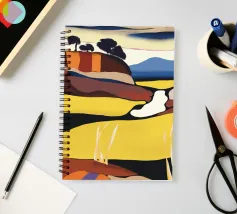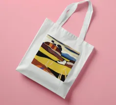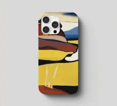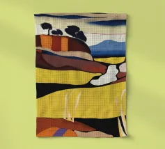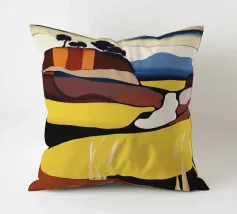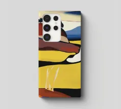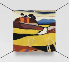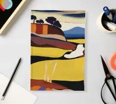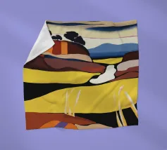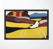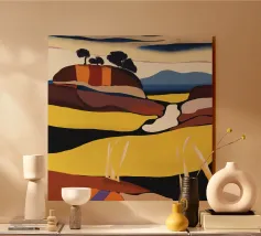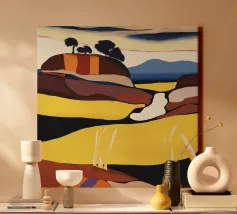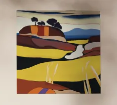 Bold colors and abstract shapes form a landscape scene, with distinct layers representing the ground and sky. The upper portion features silhouetted trees against a background with gentle gradients, suggesting a distant mountain range under a twilight sky.