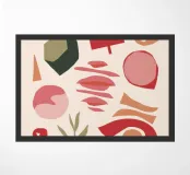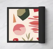 An abstract composition of deconstructed shapes, including leaves, arches, and geometric forms, arranged in a balanced and earthy color palette of terracotta, pink, and green.