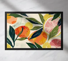 This abstract artwork deconstructs fruits like pears and oranges into their basic organic shapes and colors. The overlapping forms in a palette of ochre, blue, and green create a modern and sophisticated composition that is a subtle nod to a classic still life.