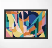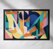 An abstract composition of overlapping, deconstructed shapes in a rhythmic arrangement. The palette of blue, orange, yellow, and nude tones creates a dynamic and harmonious piece with a sense of fluid movement.