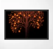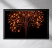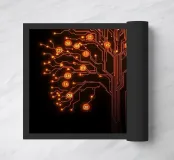 This striking digital art piece, "Digital Roots," presents a powerful fusion of nature and technology. It depicts a majestic tree, not of wood and leaves, but of glowing, intricate circuitry. Each branch and root is a pulsating line of light, connecting to "fruit" in the form of illuminated circuit nodes, some marked with numbers. The warm, fiery orange and yellow tones stand out against the stark black background, creating a mesmerizing and sophisticated visual. This work is perfect for anyone who appreciates the beauty in code, the elegance of engineering, or the profound connection between