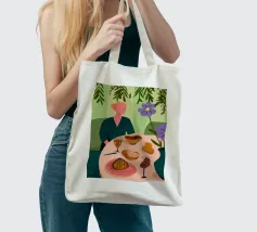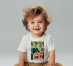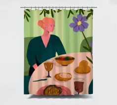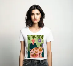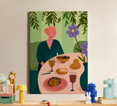 This painting illustrates a person sitting at a dining table with various foods and drinks, including bread, wine, and a bowl of soup. The background features large green leaves and flowers.