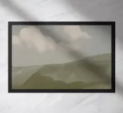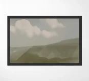 Soft, muted tones depict a serene landscape with rolling hills and a cloudy sky. The scene conveys a sense of calm and tranquility, with gentle gradients blending into one another.
