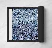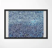 dots circles blue white pattern density gradient exhibit artist name title letters text color composition art repetition arrangement background museum