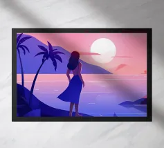 A woman in a white bikini stands at the edge of the beach, gazing at the twilight sea, surrounded by lush greenery.