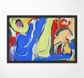Bold swirls of blue and green intertwine with vibrant red and orange, creating a dynamic and energetic composition. Abstract forms and broad brushstrokes evoke a sense of motion and fluidity