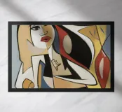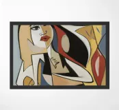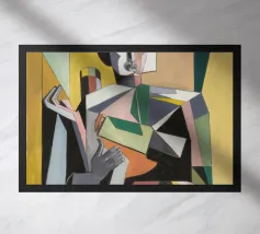 This artwork features an abstract figure in a dynamic pose, surrounded by bold shapes and colors. The composition creates a sense of movement and energy.