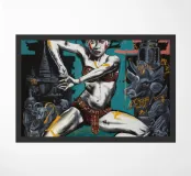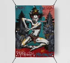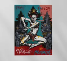 A powerful figure stands in motion, with a temple in the background. Text like 'PRAY' and 'MOVEMENTS' reinforce themes of strength and spirituality.