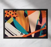 An energetic abstract composition where bold geometric shapes, lines, and patterns in orange, teal, and black collide and overlap, creating a sense of dynamic movement.