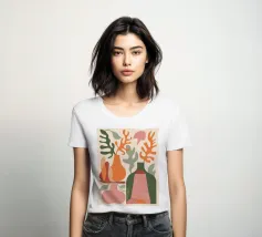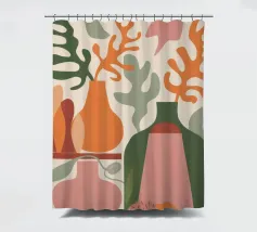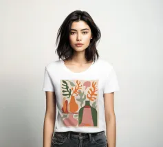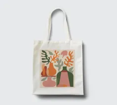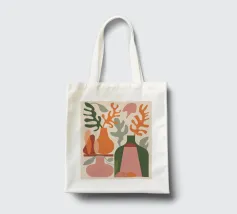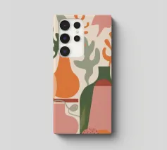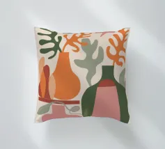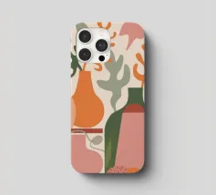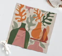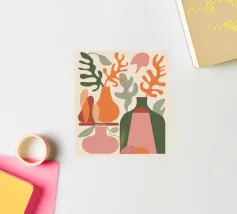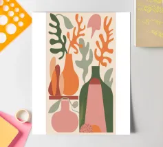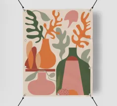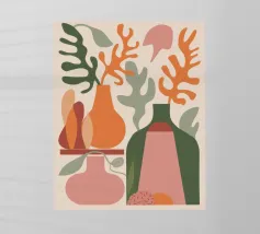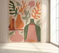An elegant and harmonious abstract still life featuring organic, leaf like shapes and vases in an earthy color palette. The composition, reminiscent of Maraoui, is balanced, calm, and sophisticated.