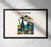 A bold, graphic celebration of Edinburgh, blending historic grandeur with contemporary design language. Iconic landmarks rise across layered hills, their silhouettes rendered in clean geometry and confident colour blocking. The composition captures the city’s dramatic skyline and sense of elevation, balancing architectural strength with a playful, modern rhythm.