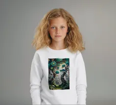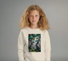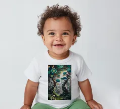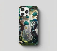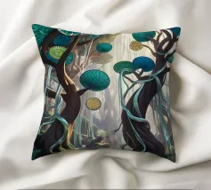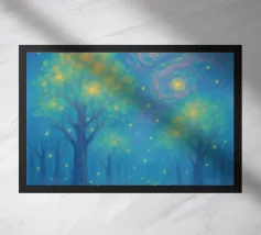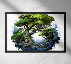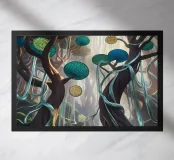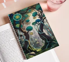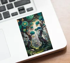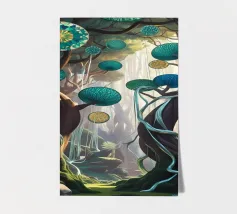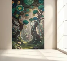 A mystical forest scene with intricate, colorful plates suspended from ancient trees. This vibrant artwork evokes a sense of wonder and tranquility.