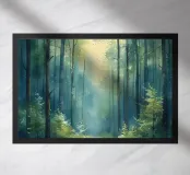 A serene watercolor painting of a sunlit path winding through a lush green forest.