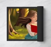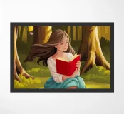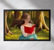 A person sits on the grass in a serene forest, engrossed in a book. Warm golden light filters through the trees, creating a magical and tranquil atmosphere.