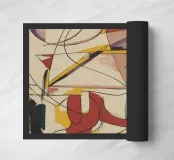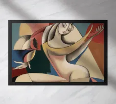 This painting showcases abstract figures in vibrant colors, including red, yellow, and purple. The composition is lively and full of energy.