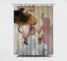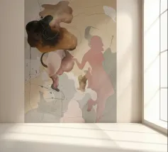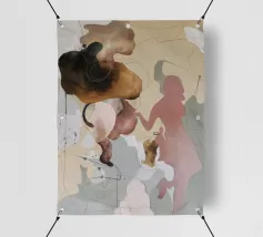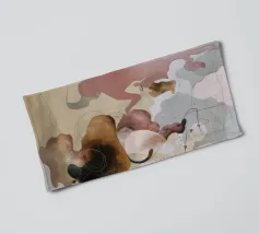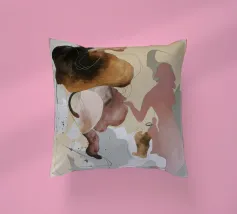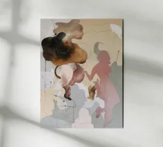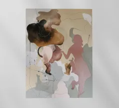 An abstract artwork with flowing organic shapes in muted earthy tones like beige, brown, and soft pink, accented by black lines and subtle grey areas, suggesting a delicate, deconstructed floral or cloud-like form.