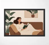 A minimalist digital painting of a woman reclining on a sofa with a book in hand. Surrounded by lush indoor plants and a steaming cup of coffee, the scene captures the essence of self-care and slow evenings at home. Perfect for modern and cozy interiors alike.
