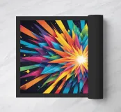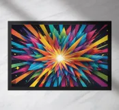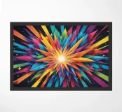 A dynamic arrangement of bright colors radiates outward, forming sharp triangular shapes that converge at a glowing center, perfect for modern digital art and desktop wallpapers.
