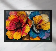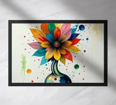 This vibrant abstract painting features a dynamic, multi-petaled flower bursting with an array of bold colors including deep blues, rich reds, bright yellows, energetic oranges, and soft pinks. The brushstrokes are loose and expressive, with visible textures and splatters of paint, creating a sense of movement and spontaneity. A dark, almost silhouetted stem grounds the kaleidoscopic explosion of color, while hints of white and muted background tones allow the vivid hues to truly pop. The overall impression is one of joyful energy and abstract floral beauty.