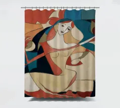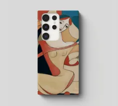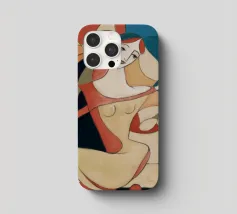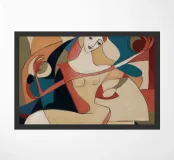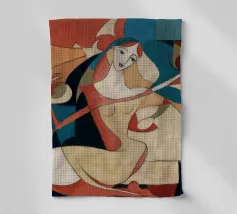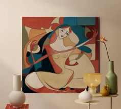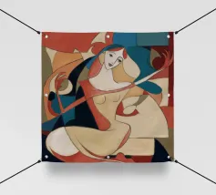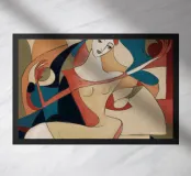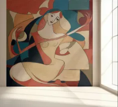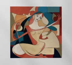 This painting shows a figure in an expressive pose, surrounded by abstract shapes and colors. The composition emphasizes the fluidity and emotion of the figure.