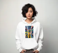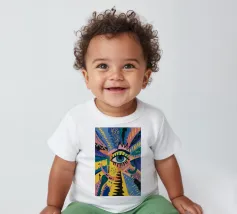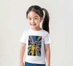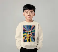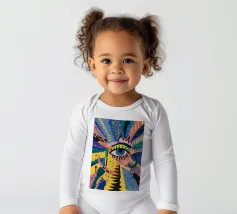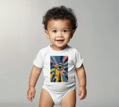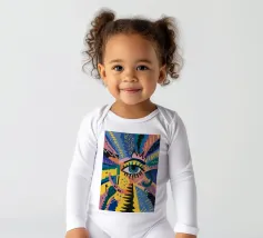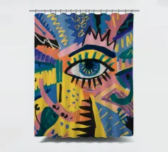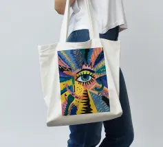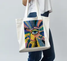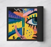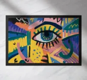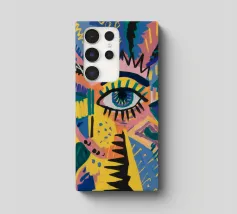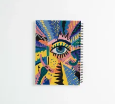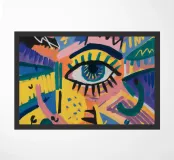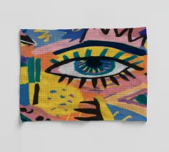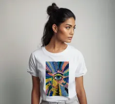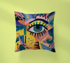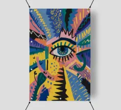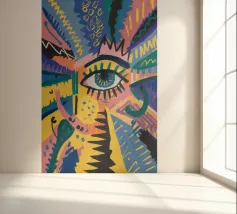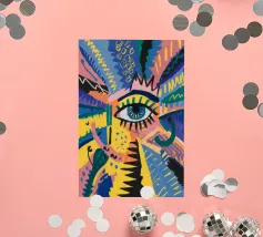 A large, detailed eye sits at the center of an explosion of color and patterns. Surrounded by swirling pink, blue, and yellow tones, the composition emphasizes perception and insight.