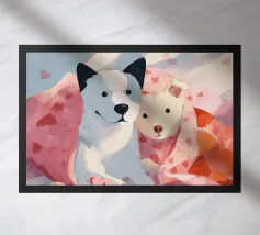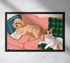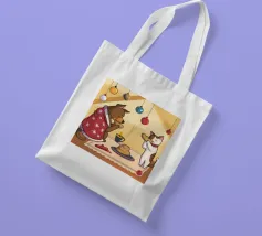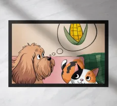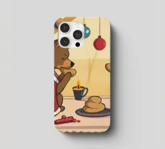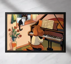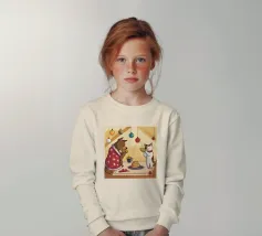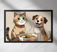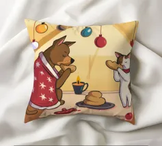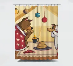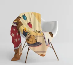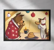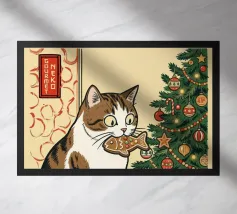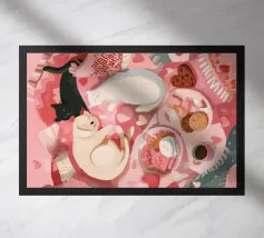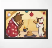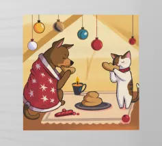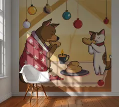 This painting shows two cats in a cozy room enjoying a festive meal. One cat, wrapped in a red blanket, gazes at a plate of pancakes, while cheerful decorations and hanging ornaments enliven the scene.