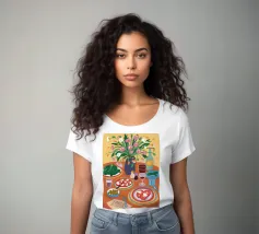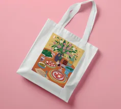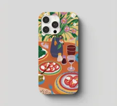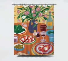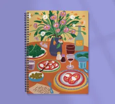 A joyful dinner table is laden with food, including a heart-shaped pizza or dish, wine, and a vase of bright flowers, set against a dark background, evoking a warm, festive, and convivial gathering.