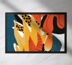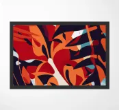 An abstract composition of tropical leaves in fiery shades of red, orange, and black creates a passionate, energetic, and bold botanical artwork.