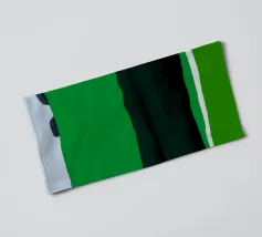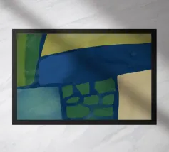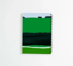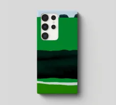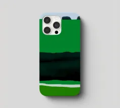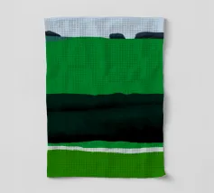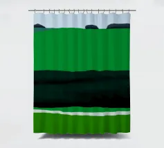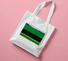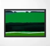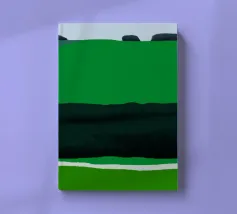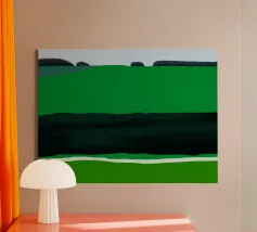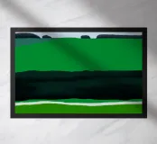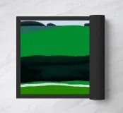 A series of layered greens and dark tones suggest a minimalist landscape. The composition evokes a sense of tranquility with horizontal bands that mimic fields and distant hills.