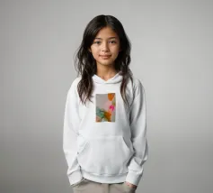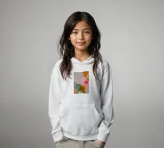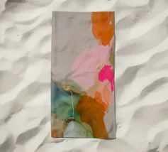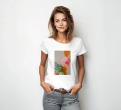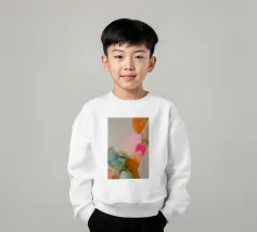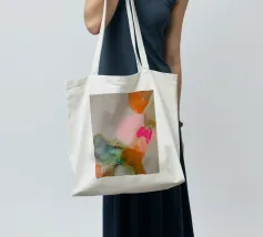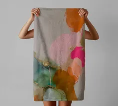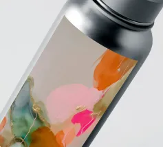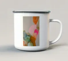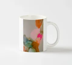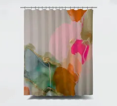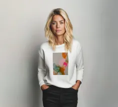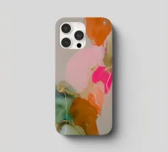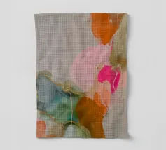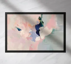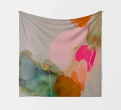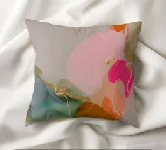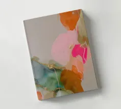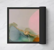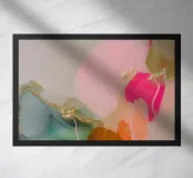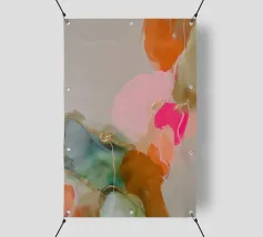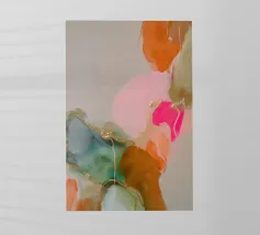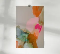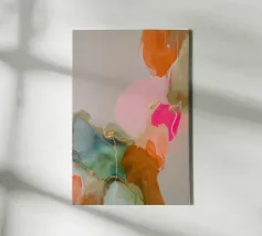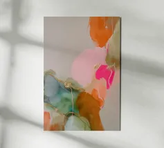 This abstract artwork combines delicate pastel areas with bright accents in pink, orange, green and elegant gold structures. The flowing, watercolour-like transitions create a light, harmonious mood with modern elegance. Golden textures add lively highlights and give the motif depth and a luxurious character.