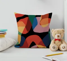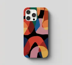 Flowing, translucent, organic shapes in a palette of red, orange, and teal seem to dance and overlap against a dark background, creating a fluid and dynamic abstract composition.