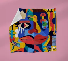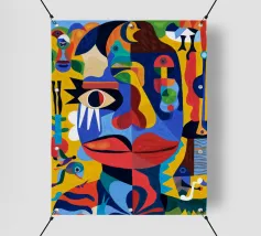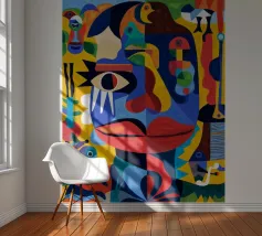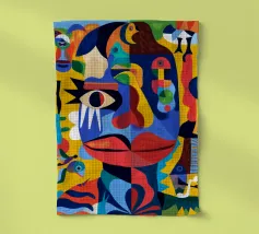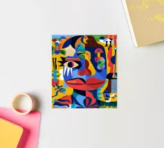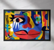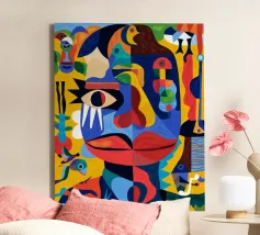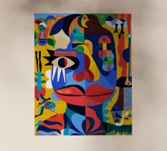 Bold lines and geometric shapes create expressive and fragmented portraits. This painting captures the complexity of human emotion through a modern lens.