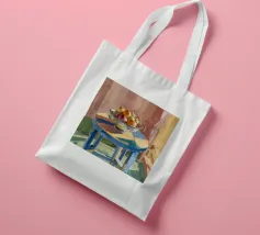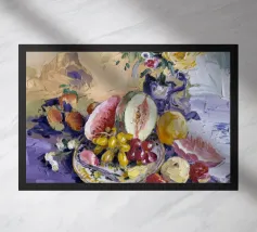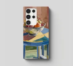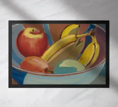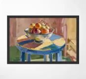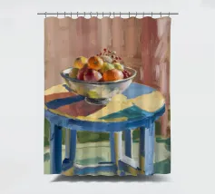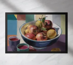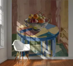 A bowl of fruit glows under sunlit shadows on a rustic table, evoking cozy stillness and domestic charm.