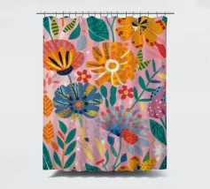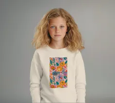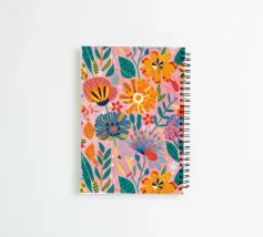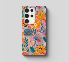A playful pattern of abstract leaves and orange flowers forms a joyful repeat design full of energy.