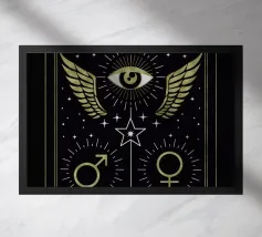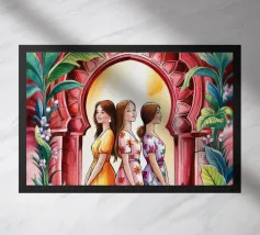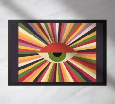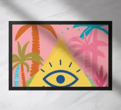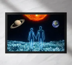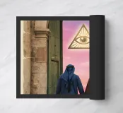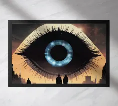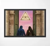 This surreal artwork portrays two robed figures walking hand-in-hand through an ancient stone archway toward a glowing sky of pink and violet hues. Above them floats a radiant geometric eye, symbolizing awareness, mystery, and deeper understanding. The blend of historic architecture, soft sunset colors, and symbolic iconography creates a scene filled with meaning and imagination. Ideal for fans of spiritual art, surreal storytelling, and thought-provoking wall décor that inspires curiosity and reflection.