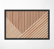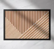 Striking geometric design featuring white parallel lines arranged in various orientations, creating triangular and trapezoidal shapes against a brown background, resembling a wooden texture.