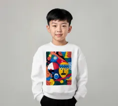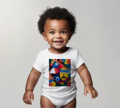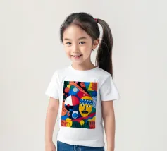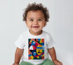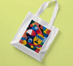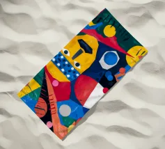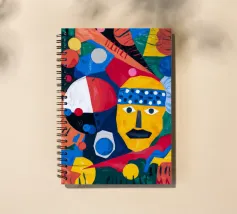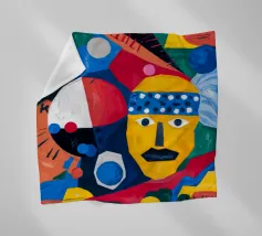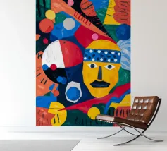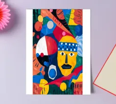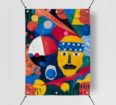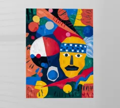 In "Geometric Whimsy," the exuberant energy of abstract art is captured through a kaleidoscope of geometric shapes and vivid colors. Circles, triangles, and rectangles dance across the canvas in a harmonious symphony of blue, red, yellow, green, and orange. The focal point is a stylized yellow face adorned with a blue and white patterned headband, black eyes, and a striking black mustache, adding a touch of playful character to the composition.