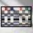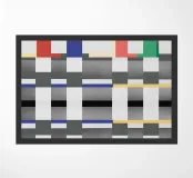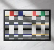 A geometric composition features a grid of colorful rectangles and squares interspersed with shades of gray, creating a modern and abstract pattern. The arrangement of different colors and gradients gives the piece a rhythmic visual flow.