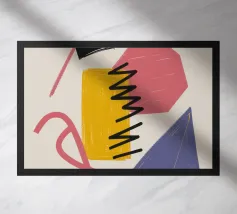Bold geometric shapes in blue, yellow, and pink contrast against a neutral background. Organic shadows and colorful dots provide a dynamic and abstract composition.