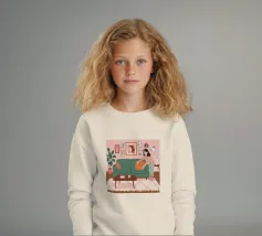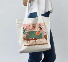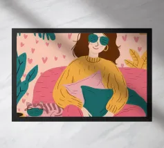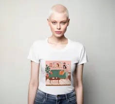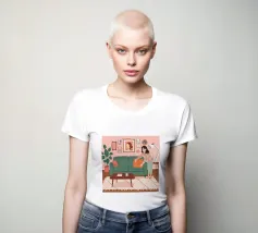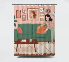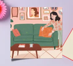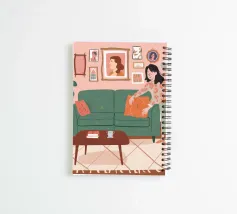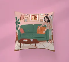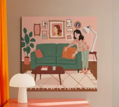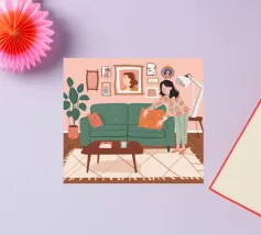 An illustration of a woman reading a book on a comfortable green sofa in a room with a gallery wall. The scene is a cozy, stylish, and perfect depiction of a quiet, literary escape at home.