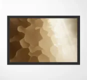 A close-up view of a honeycomb structure reveals intricate patterns bathed in soft, warm light highlighting the natural beauty and texture. The play of light enhances the details.