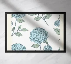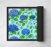 Pretty hydrangea floral pattern with lush and vibrant blue hydrangea flowers with green leaves, on a light blue background.