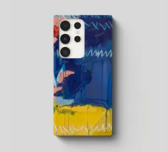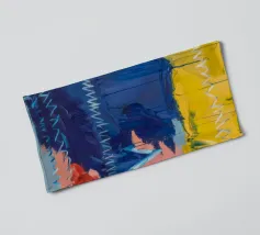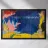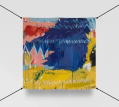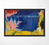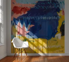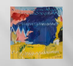 A bold abstract landscape with a large, dominant indigo blue triangular or mountainous form, set against a vibrant yellow foreground with red and white accents, creating a powerful, echoing presence.